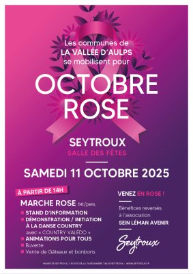 Cette année la journée se déroulera à Seytroux le samedi 11 octobre 2025, à la salle des fêtes pour une MARCHE ROSE au profit de "Seins Léman Avenir".