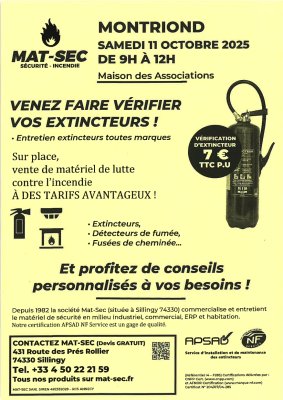 Samedi 11 octobre de 9h à 12H à la maison des associations venez faire vérifier vos extincteurs.