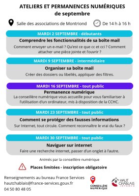 Zoom sur les ateliers et permanences numériques organisés et animés par la Conseillère Numérique de la CCHC pour le mois de septembre 2025.