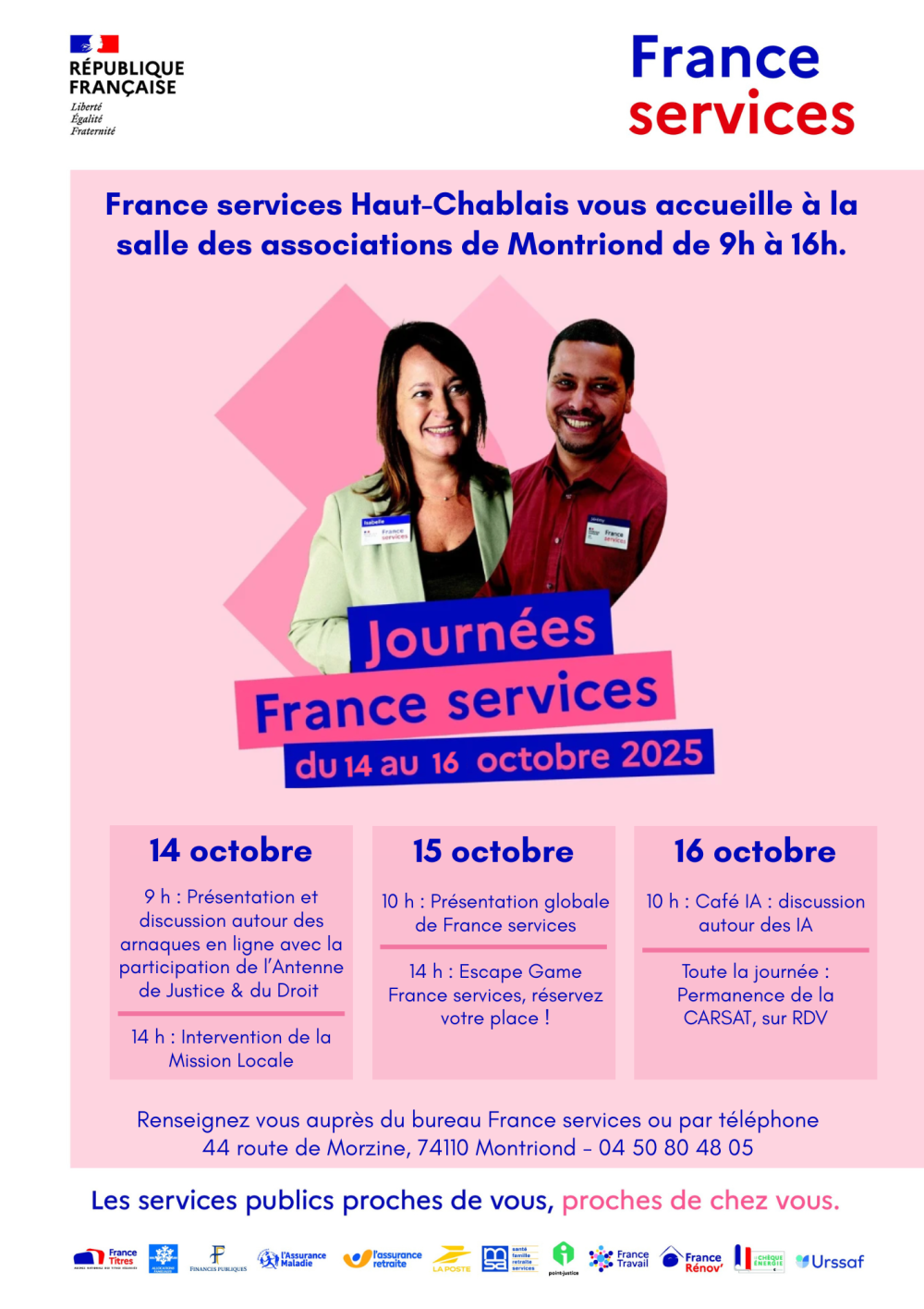 France services Haut-Chablais vous accueille à la salle des associations de Montriond de 9h à 16h du 14 au 16 octobre.