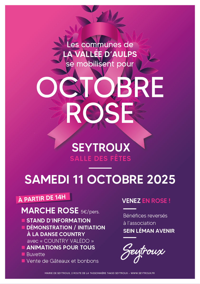 Rendez-vous nombreuses et nombreux samedi 11 octobre à la salle des fêtes de Seytroux pour une MARCHE ROSE au profit de "Seins Léman Avenir".
